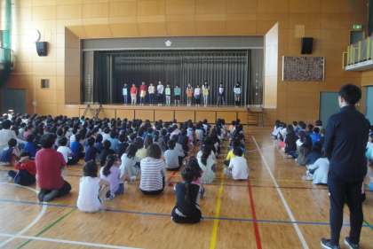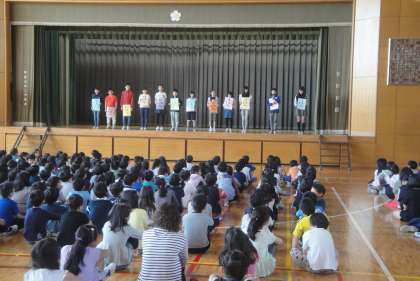 5月8日(水)朝の時間に全校の児童が体育館に集まり、6年生のたてわり班長の紹介がありました。1年間宜しくお願いいたします。