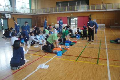 5月9日(木)午後に池尻小学校の体育館で、中里小学校・三宿小学校と池尻小学校の職員が集まり、世田谷消防署や消防団の方に来ていただき、合同救急法研修会を実施しました。毎年水泳指導の前のこの時期に実施しています。