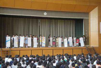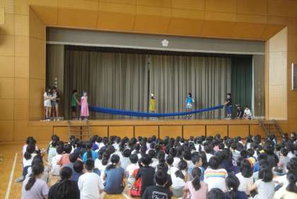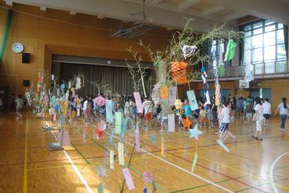 飾りつけが終わってから、集会を行いました。はじめに各クラスの願い事を発表しました。つぎは、集会委員による七夕の劇です。七夕の由来が分かりました。ありがとうございました。