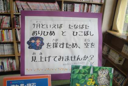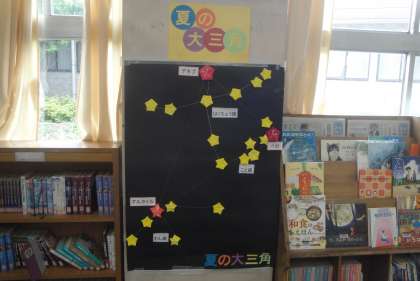 もうすぐ夏休みです。図書室では、7月ということで、夏の星座や虫についての本の紹介がありました。図書室にいるだけで何だかわくわくしてきます。本を借りに来てくださいね。
