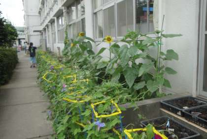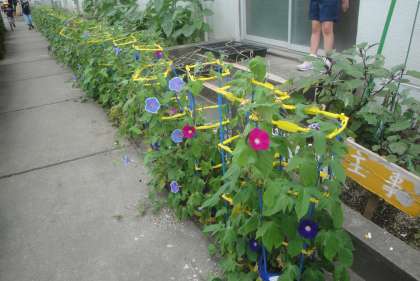 7月11日(木)少し肌寒い日でしたが、教室の横に置いてある鉢には、朝顔の花がたくさん咲いていました。色鮮やかにたくさん咲いています。
