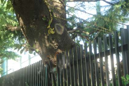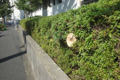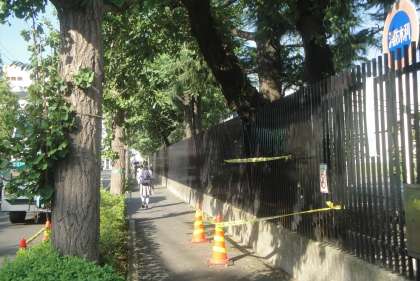 9月10日(火)9日の朝、台風が去って、児童が登校する前に、体育館前の木が歩道を邪魔するように倒れていました。職員が木を切って対応した後の写真です。また、桜の木が歩道側に倒れていることがわかりました。早くに対応する予定です。