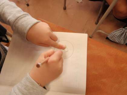 3年生は、丸い形を描く方法を考え、定規を使って中心から同じ長さの点をいくつも打ってつなげたり、工作用紙で作ったコンパスを使ったりして、円を描きました。また、円の特徴を見付けました。