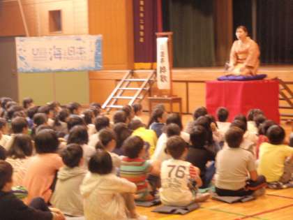 4・5年生は、「海の親子寄席」の出前授業を受けました。海ごみやプラスチックごみなどをテーマにした落語を聞き、環境について考えました。