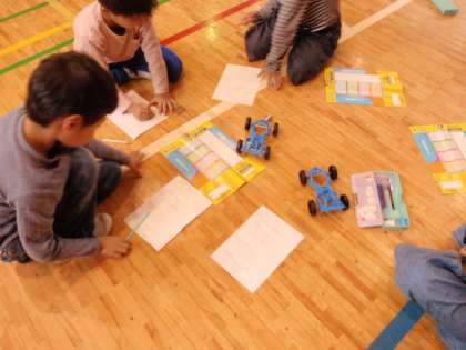 3年生の理科では、電気を通すものと通さないものとを調べる学習や、ゴムの力で車を走らせ、ゴムの数などの条件を変えたときの走る距離の違いを調べる学習をしていました。