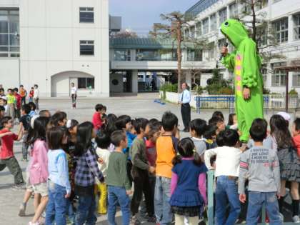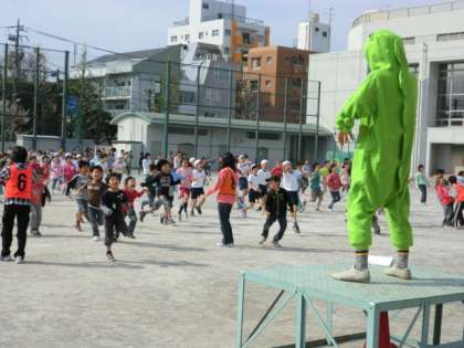 そして、ゲストティーチャ—として、「ガチャピン先生」が来てくれ、低学年は大盛り上がりでした!
