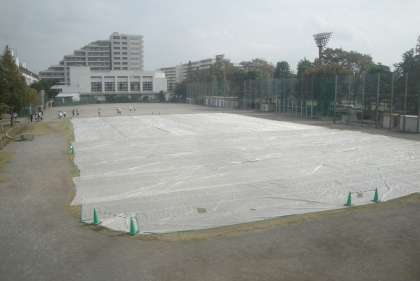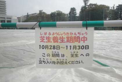 11月30日(土)までは、芝生の養生期間です。冬芝の種をまきました。元気に芽が出るまでの間、白いシートを敷いて管理しますのでよろしくお願いいたします。