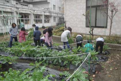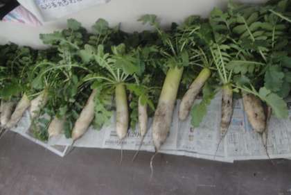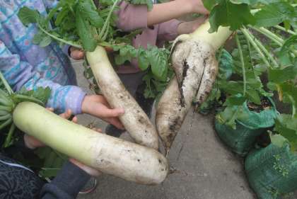 12月9日(月)今日は、3年生が大根の収穫をしました。今年は、台風が多く上陸し、雨も多かったので、うまく育ちませんでした。しかしなんとか全員1本ずつは収穫できました。家で味わって食べてください。