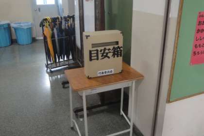 12月16日(月)今日の全校朝会で、代表委員会の児童が、目安箱について話をしました。「学校をよくするアイディアを募集します。」と全校児童に向けて話をしました。3か所の下駄箱に目安箱を置いたので、そこに意見を書いて入れます。