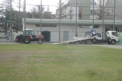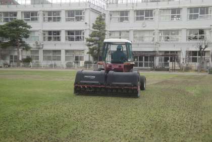 3月5日(木)今日は、校庭の芝生のメンテナンスのために業者が来て芝生の整備をしました。