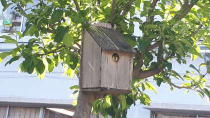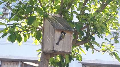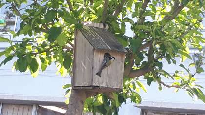 ビオトープにかかっている橋の近くにあった巣箱に、シジュウカラが住み着き、かわいいひなが生まれていました。とても、元気な鳴き声が聞こえます。