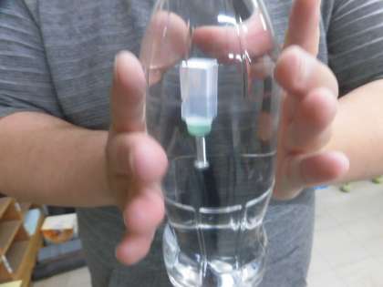 4,ペットボトルを両手でギュッと力を入れて押します。・・・しずむ!
