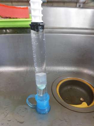 水の中でタレビンを少し押し、空気の泡1つ分を