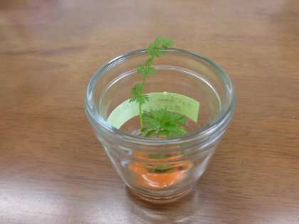 料理でにんじんを使うときに、捨ててしまうヘタの部分を水につけて置きました。(左の写真)