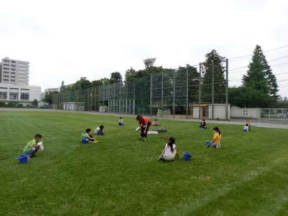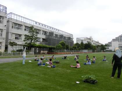 2年生は、今日、「野菜づくり名人になろう」という学習で、ナス、ミニトマト、ピーマンの苗をそれぞれ一生懸命、鉢に植えていました。芝生の上で、のびのびと、とても気持ちよさそうでした。活動のあとには、皆、しっかり丁寧に手を洗っていました。