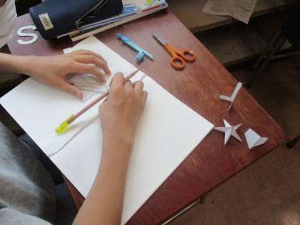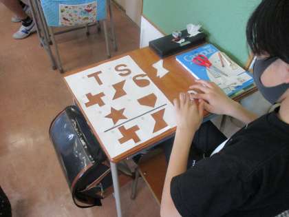 線対称や点対称の図形を切り取り、折ったり回転させたりして、その特徴を調べていました。