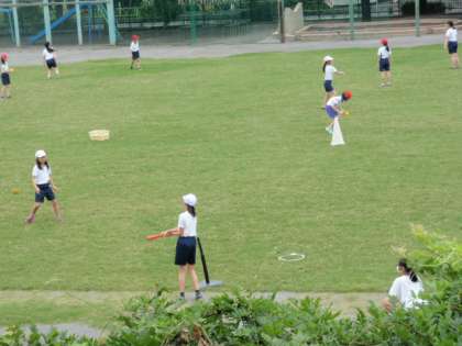 校庭の芝生では、体育や休み時間に体を動かす子どもたちの姿がたくさん見られます。