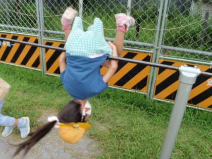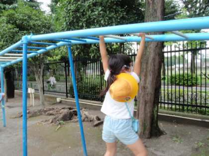 写真は、左から、Tボールをする5年生、うんていや鉄棒(だるま回り)をして遊ぶ1年生です。