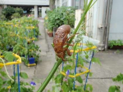 ヘチマの様子を見ていたら、ツルの途中にセミの抜け殻がついているのを見付けました。