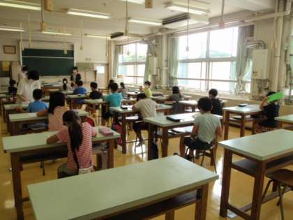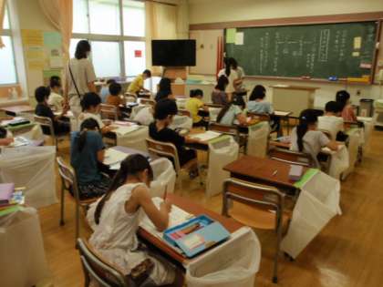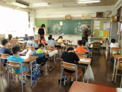 1年生は1年1組の教室で、2年生は家庭科室で、3・4年生は4年1組教室で、5・6年生はランチルームで行っています。