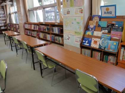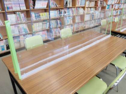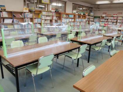 先日、パーテーションを購入することができたので、机の真ん中に立て、2学期からは、図書室で調べ学習をしたり、本を読んだりできるようにしました。一つの机に座れる人数も減らしたため、席の足りないところは、長机を置きました。
