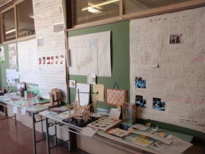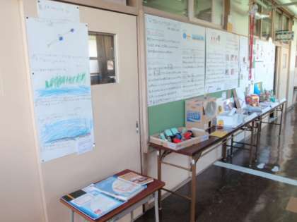 各学級の廊下に、子どもたちが夏休み中に作った作品や調べたことをまとめたノート・壁新聞などを展示しています。力作ぞろいです。