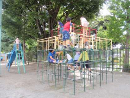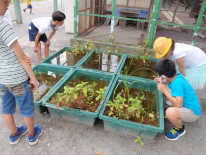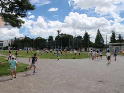 たくさんの子どもたちが、しばっち(芝生の校庭)でドッジボールやボール投げ、鬼ごっこなどをしたり、つっちー(土の校庭)でサッカーをしたりしていました。また、校庭周りでは、ビオトープの様子を観察したり、ジャングルジムや滑り台で遊んだりする姿が見られました。