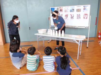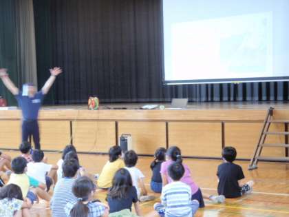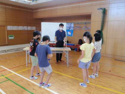 4年生は、1・2時間目に「英語・異文化体験教室」を体育館でおこないました。これは、例年4年生が行っている教育センター移動教室が今年はなくなったため、代わりにおこなった学習活動の一つです。普段は「タッチ・ザ・ワールド」にいらっしゃる先生や外国人講師(ALT)の先生方がいらしてくださいました。