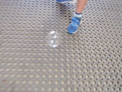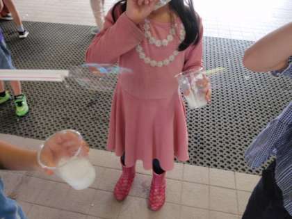 1年生は、生活科の学習活動で、しゃぼん玉遊びをしました。雨が降っていたため、ピロティーで活動しました。