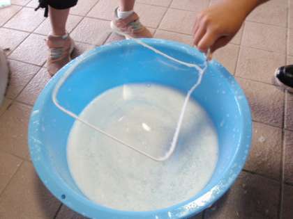 どうしたらうまくしゃぼん玉を作れるかを考えて伝え合い、安全に遊ぶための約束を決めてから遊び始めました。
