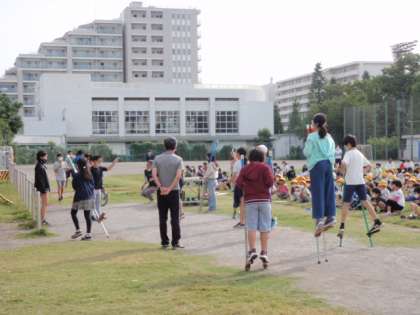 5・6年生の運動委員会の児童が、全校のみんなに運動の楽しさを伝えようと、竹馬、一輪車、長縄(ダブルダッチ)の技を披露しました。目を見張るような技が続き、大きな拍手が起こりました。