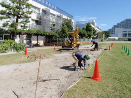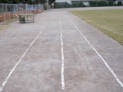 運動会に向けて、9月末に、生え広がっていた芝をはがして平らに整地しました。また昨日は、運動委員会の子どもたちと職員とで、直線コースのラインテープを張りました。