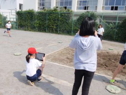 今日は、初めに世界陸上の選手の跳ぶ様子(動画)を見てイメージをつかみました。その後、二人一組になり、「幅跳びをする」・「タブレットPCで撮影する」を交代しながら練習に取り組みました。跳ぶごとに自分の跳んだ様子を動画を見て確認したり、友達の上手だったところやアドバイスを伝えたりしていました。