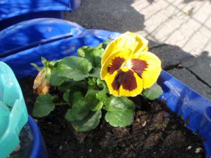 写真は、左から、休み時間の校庭、1年生の植えたパンジー、環境委員会が種をまいたコスモスの様子です。
