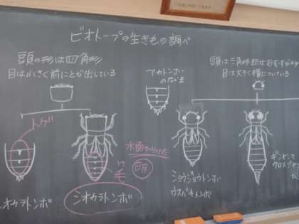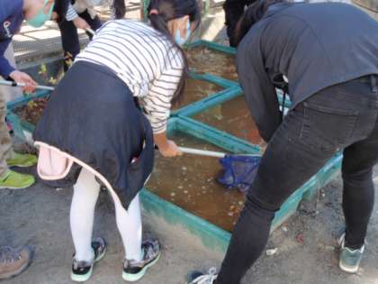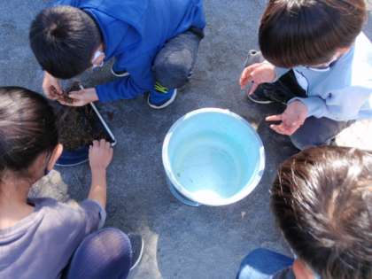 ビオトープにどのような生き物がいるかを観察するために、グループごとにたもで底の土をすくいあげ、その中にいる生き物を探しました。3種類のトンボのヤゴを見付けることができたようです。