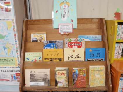 図書室にも、これまでの周年記念誌、開校した昭和30年(1955年)の頃の様子が分かる本、この年に生まれた作家の本などを展示し、子どもたちが手にとって読めるようにしています。