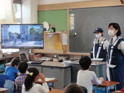 今年度は、実際に自転車に乗って学習することができないため、教室でビデオを見ながら危険な場面を見付けたり、どのようにすることが大切なのかを考えたりしました。