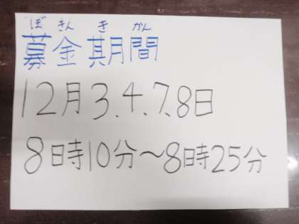 募金活動は、12月3日(木)・4日(金)・7日(月)・8日(火)の4日間行います。ご協力いただけるご家庭は、よろしくお願いいたします。