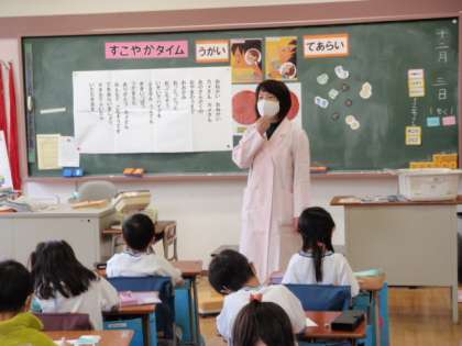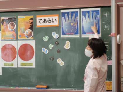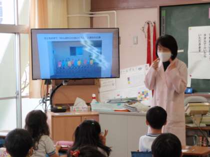 今日は、1年生が取り組みました。1年生の保健指導のタイトルは「めざせ!手あらい&うがい名人」です。養護教諭のするうがいの見本(水なしですが)を見たり、手を水だけで洗った場合と泡立てた石けんを使って洗った場合との違いを写真を見て学んだりしました。