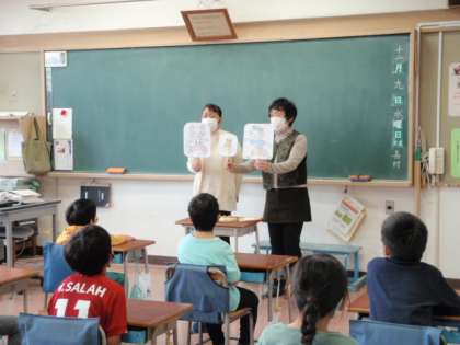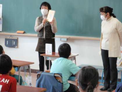 例年は、図書室で近くに座ってお話ししていただいているのですが、今年は、教室の自分の席に座ったまま、お話を聞きました。ペープサートを観たり、本の紹介をしていただいたりして、豊かな時間が流れていました。
