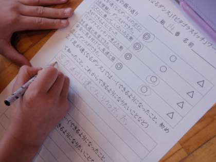 そのあと、表現運動をしました。初回の今日は、グループで、音楽に合わせて4つの動きを作り、見せ合いました。楽しそうな笑い声や拍手がたくさん聞こえた一時間でした。
