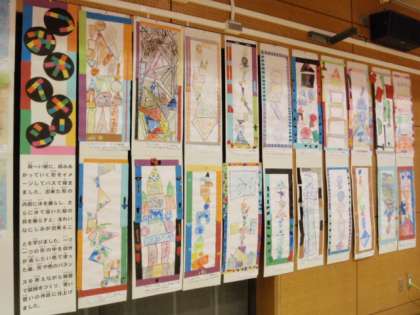 「つみきイメージ」は、長い紙に、積み上がっていく形をイメージしてパスで描いた中に、絵の具を使ってきれいな「にじみ」で色付け、描き上げた作品です。