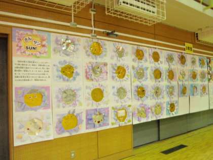 「さん・サン・SUN!」は、染料で染めた紙を切って太陽が顔を出すように形づくり、身近な素材で太陽の表情を思い思いにつくって仕上げた作品です。