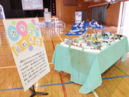 「カラフル粘土」は、紙粘土に絵の具を混ぜて色粘土をつくり、プラスチックの箱や段ボールなどに貼り、飾りを付けて仕上げた作品です。