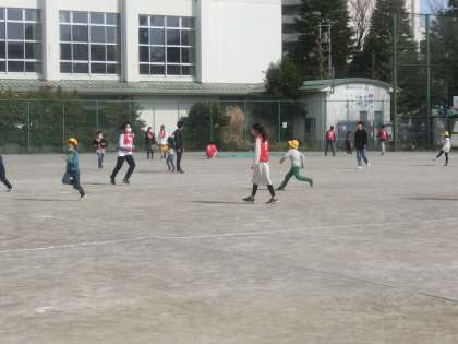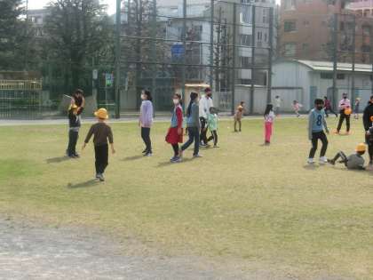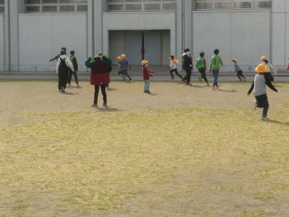 大縄跳びでは、1年生が縄に入るタイミングをつかみやすいように、そっと背中を押したり、タイミングに合わせて「はい!」「今!」などの声をかけたりしていました。1年生が、どんどん上手に跳べるようになっていき、子ども同士の教え合いのすごさを実感しました。また、おにごっこでは、6年生のおにに捕まらないように、力いっぱい走る1年生の姿が印象的でした。