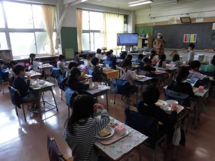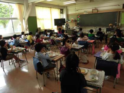 1年生は今日から給食が始まりました。自分たちで配膳をしました。