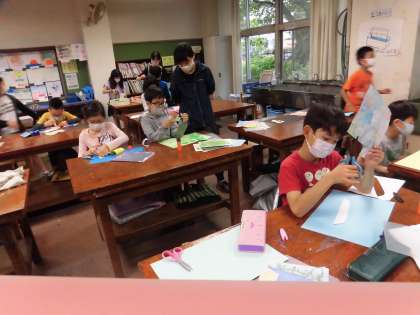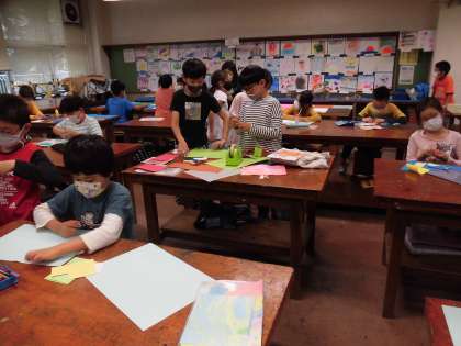 図工の時間です。紙を切ったり貼ったりして作品づくりをしました。参考資料をみたり、友達の作品を鑑賞したりして、創作をしていました。