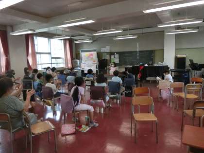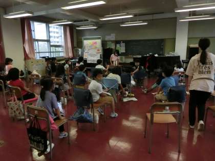 2年生の音楽の授業で、マラカスの学習をしました。本物のマラカスの音を聞いた後に、中に入れるものはどんなものがいいか、音のイメージに合う材料をそれぞれに考えました。次に図工の授業で、子どもたちが家から持ってきた材料を紙コップに入れて、左右の音がなるべく同じになるように材料を調節したり、左右の絵や模様を関連させたりして、「紙コップマラカス」をつくりました。最後に音楽の授業で、つくったマラカスを一人一人が発表しました。「材料によって音色が変わる」「いろいろな音がある」「縦に振るのと横に振るのとでは、音がちがう」など、いろいろな気づきがあり、学習が深まりました。