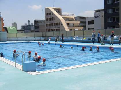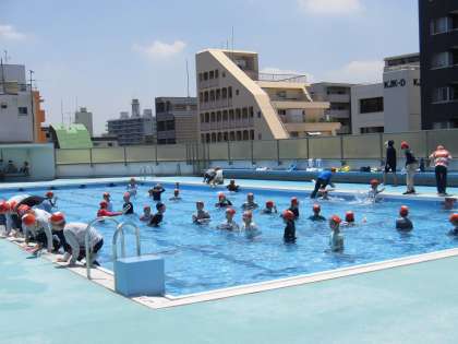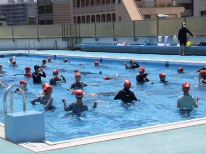普段着で水の中に入ることで、負荷がかかり、思うように泳いだり行動することができないことを体感しました。