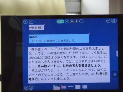 ロイロノートに問題が出ています。この問題が学校にいる子どもと家庭にいる子どもの両方が取り組めるように出されています。この問題をそれぞれがノートに写して真剣に学習に取り組んでいました。